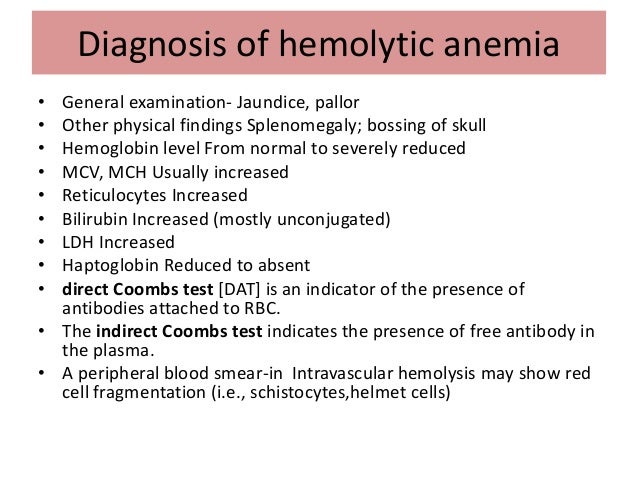 lab work up for hemolytic anemia from image.slidesharecdn.com The peripheral smear and reticulocyte count are the most important tests to diagnose hemolysis. Managing hemolytic anemias includes avoiding suspect medications, treating infections and taking drugs that suppress your immune system, which could be attacking your. Warm antibody hemolytic anemia cold agglutinin disease paroxysmal cold hemoglobinuria.